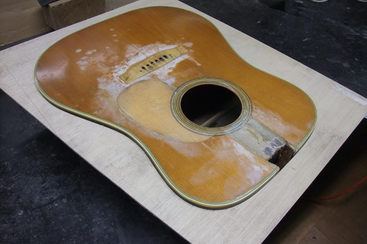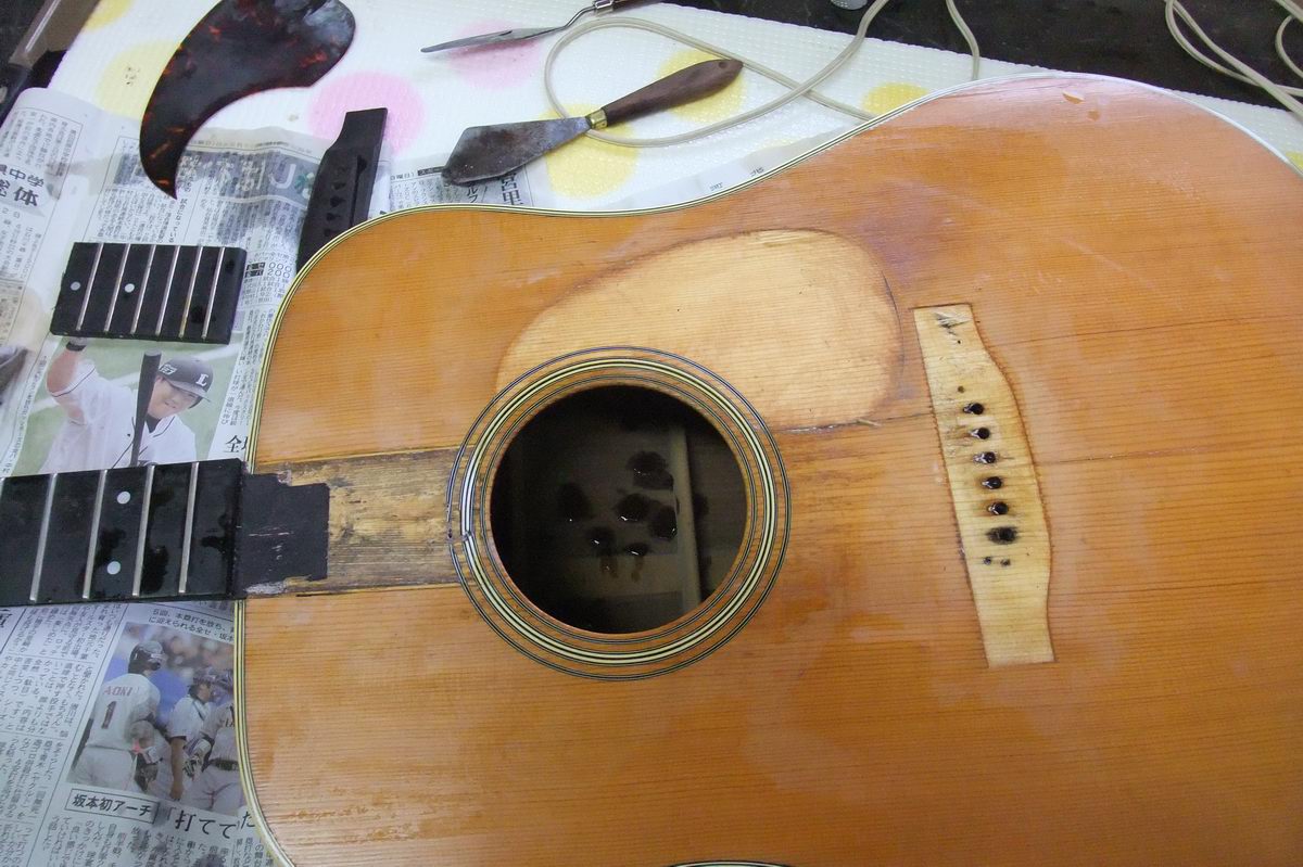 ホールより上の力木もはずす必要がありそうなので、その部分の指板が邪魔になる。