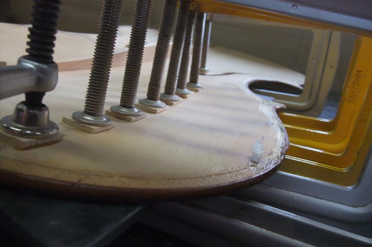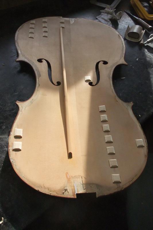 チェロ(?)の表板の割れ修理。