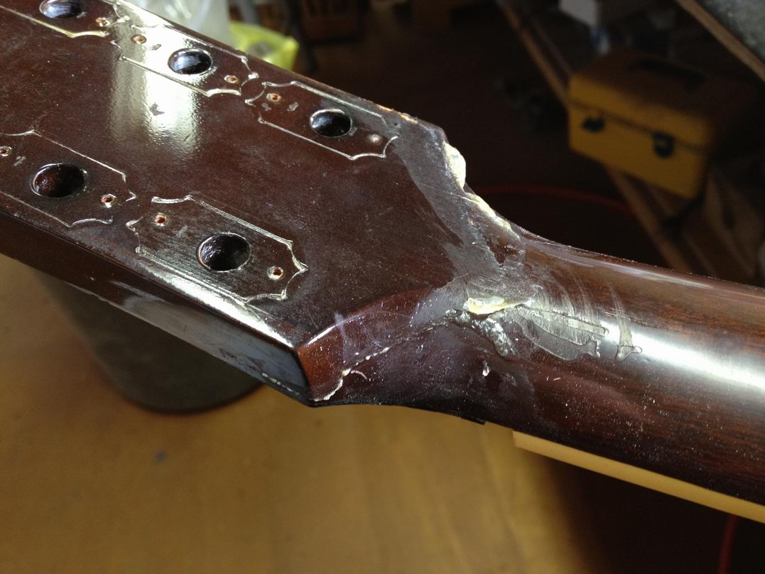 ギブソンのヘッド折れ。 断面は比較的きれいで、ヘッドが取れてしまってはいない。 そのままギッチリ接着。