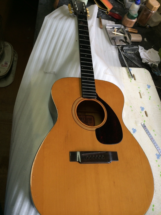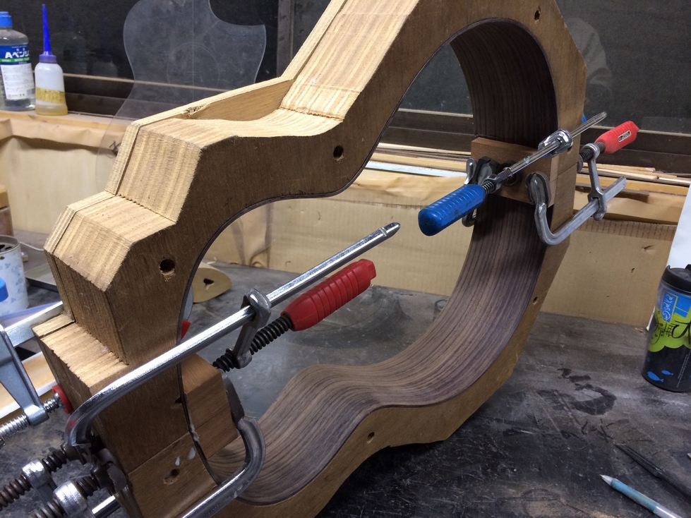 少し逃げる 2013年12月10日 tupli コメントする 大荒れの予報だったので表裏の作業を回避したけど、それほどでもなかった。 ヒールのくっついたネックは荒加工してすっかりネックらしい形に。 長さも違うし間違えんようにせんとなぁ。 修理は古いヤマハ。 ナットとサドルを交換。 特にサドルは換えて大正解。音も良くなったはず。 argoのサイドにブロック接着。 追っ手が足踏みしている間に少し逃げる。