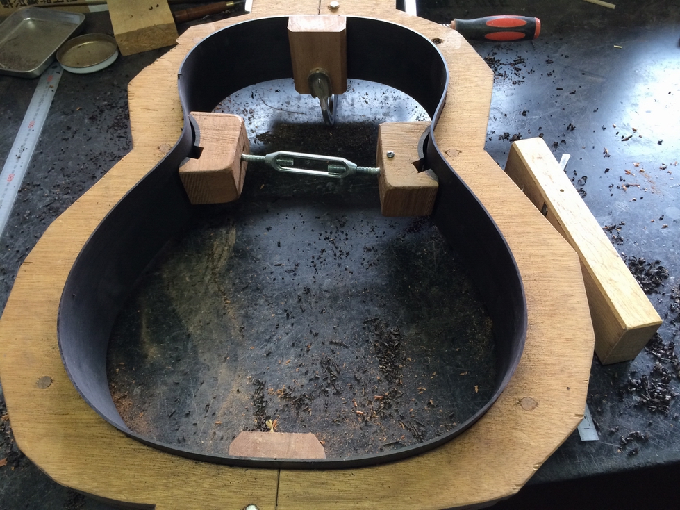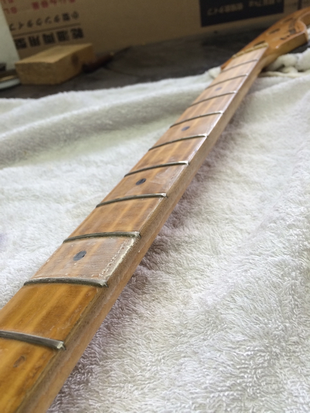 ネックの塗装がこれ以上はがれちゃわないよう、薄く塗装吹いた後の図。