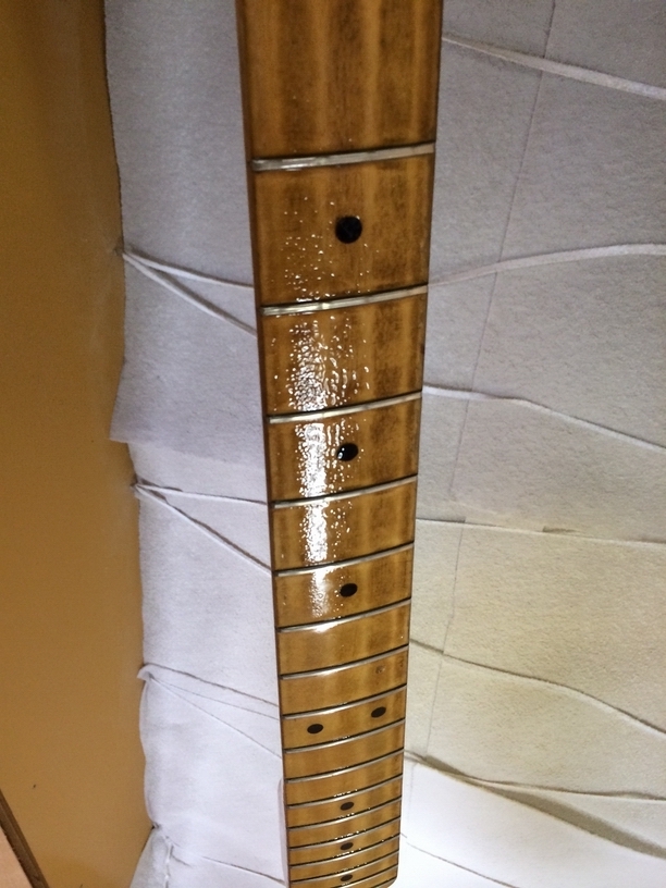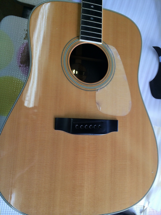 糊取り 2014年3月19日 tupli コメントする 指板上だけ塗装が食いつかないねぇ。 あんなにしっかり研磨したのに。 ひび割れていたから、シリコンスプレー的な何かが染み込んでいるのかもしれない。 ピックガードをはがすと、とってもしつこいテープと糊が残っている。 この存在を忘れていた。 はがすのにはちょっとしたコツと、根気がいるのだ。 ピックガードを交換した。