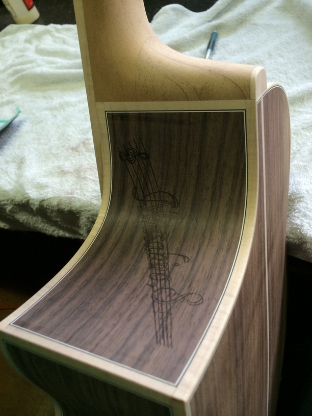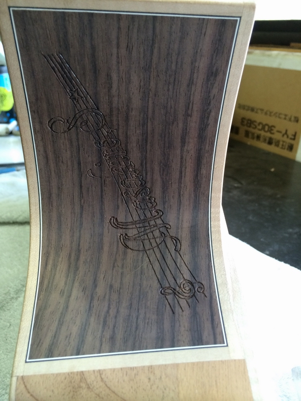 今日は早朝から一日かけてカッタウェイ上のインレイデザインを彫り込んだ。いやぁ、我ながらいいペースではかどった。難しいのはこの後だから。