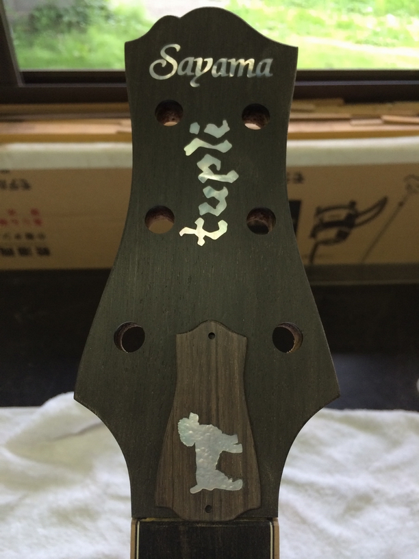 指板インレイはかわいらしく完成。アバロンはあえて色の鮮やかな面と逆の面を利用した。