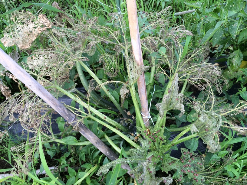 それから、雨と関係があるか、ないかもしれないが、ニジュウヤホシテントウの大量発生によってキュウリ、ナス、ピーマンが非常に弱っている。ズッキーニは全ての葉が食われつくして瀕死。