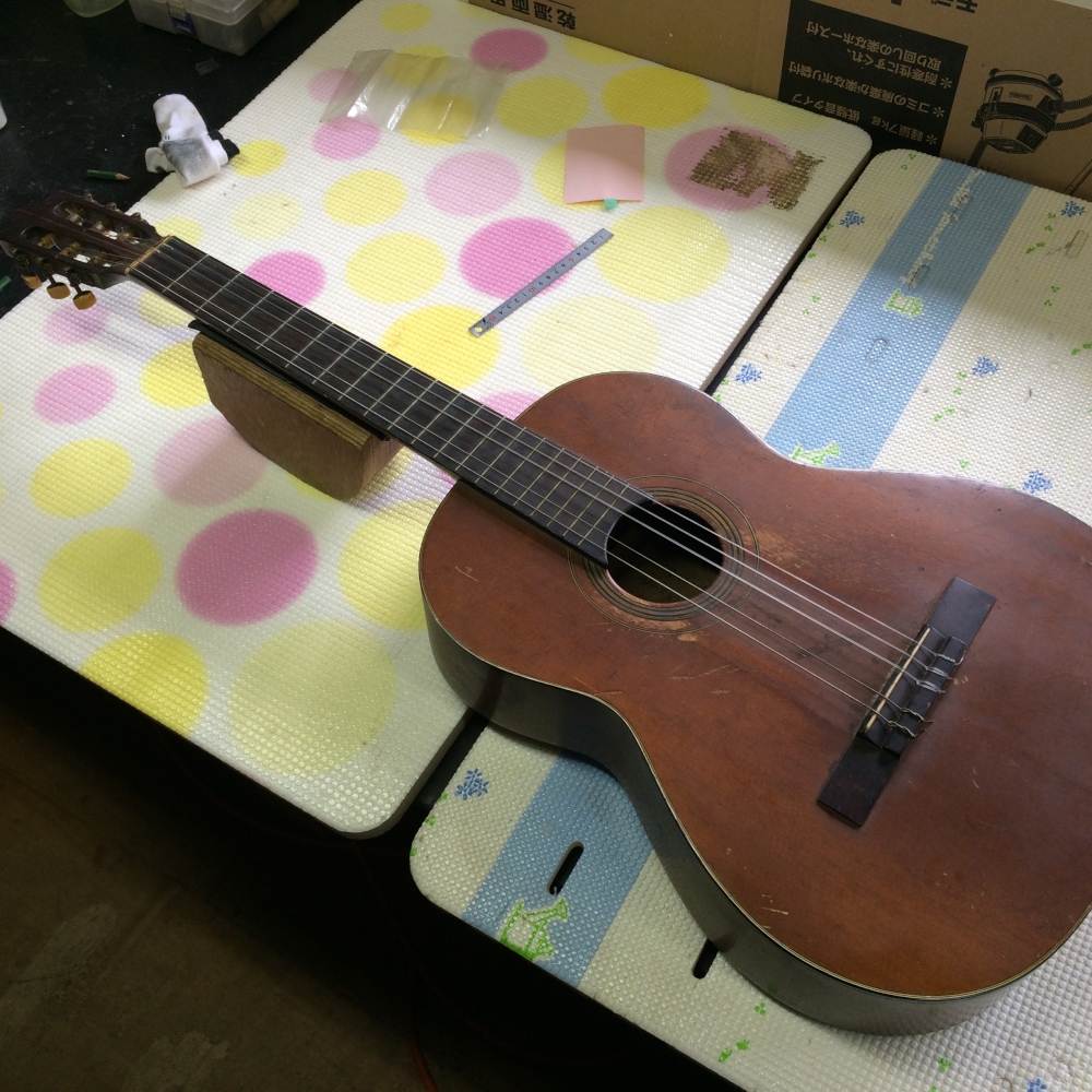エレキのフレット交換修理も納品して、次はガット修理。ブリッジが浮いてしまっているのを剥がして付け直す。