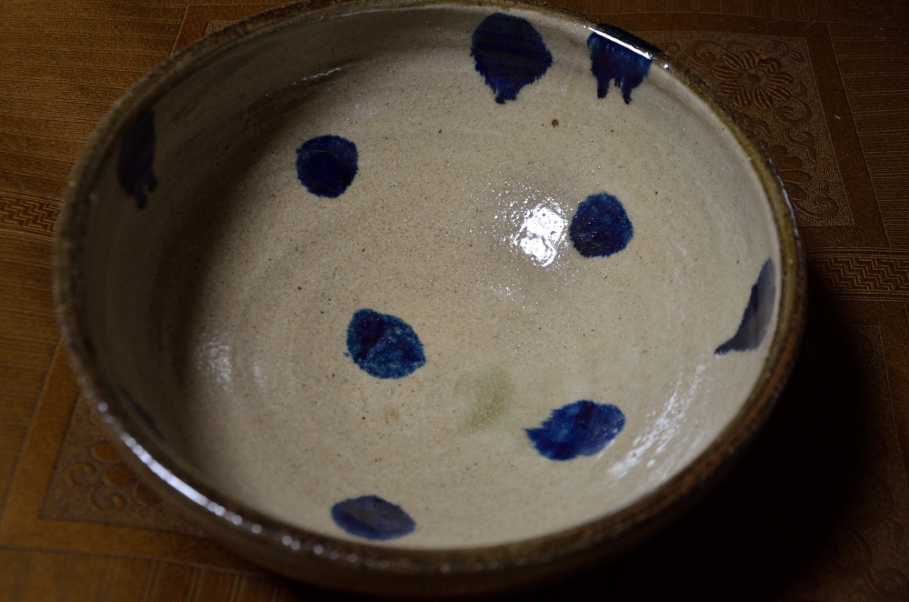 (よみたん)のやちむん(焼き物)だよって。わざわざ頼んで焼いてもらったみたい。我が家で最大サイズの大鉢。ちょっとブチャラティを彷彿。嬉しいね。彼の所、無事に第二子誕生したみたいだし、何かお祝い返しをしたいのだけれど何がいいかなぁ。
