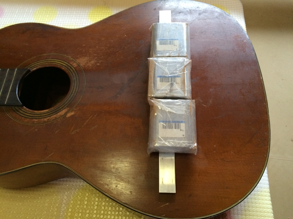 昨日のガットギター、普段はやらない挑戦を慎重に試してみる。軽く押すだけでたわむので、板を少し湿らせて、少しずつ重石を乗せて、グンと膨れた腹を少しでもおさえられたらと。3kg乗っかった。これで一日二日乾燥させる。なにせブリッジがねじれた。削る量を減らしたい。