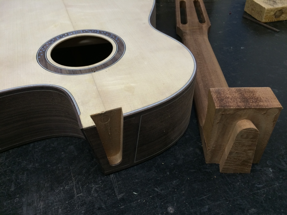 それからジョイントの蟻溝加工。その前にネックの指板面とヒールの底とが基準面になるので整える。このグズッとした治具で大まかなヒール底面の角度を決める。これ、なんだかんだ12年ぐらい前に作った道具。