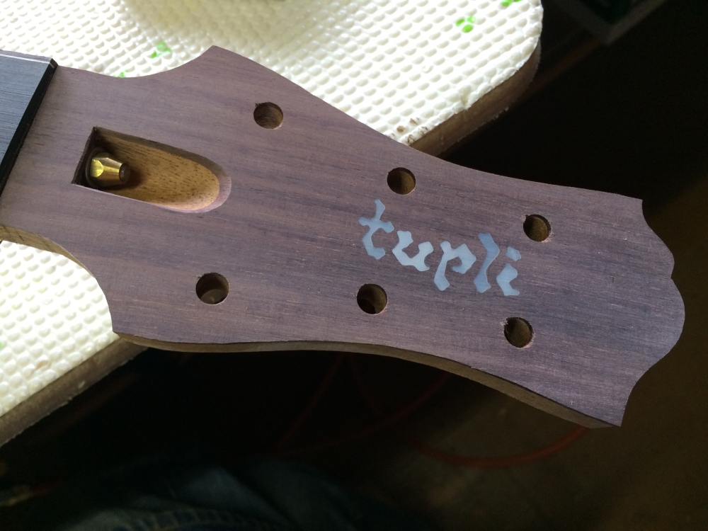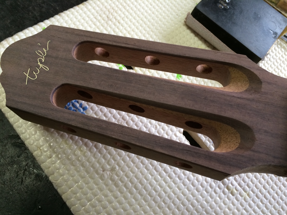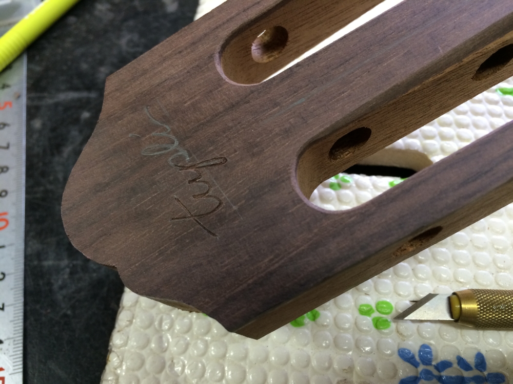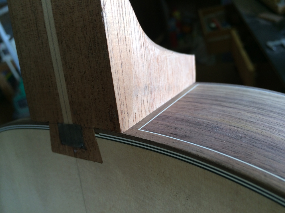 ヒールキャップを付ける。ノミで一段掘り下げて。ヒールキャップもヘッドプレートも最初の加工前、ジョイントよりずっと前に付けておくのが工場的なやり方だろうね。手数が少なくて済むし楽だから。でもこのタイミングの方が誤差が吸収出来たりして仕上がりが綺麗だと思うのよね。少々面倒でもやりやすいと思う方法で。