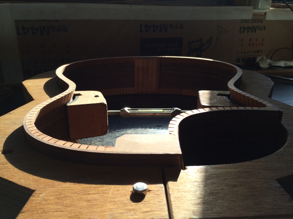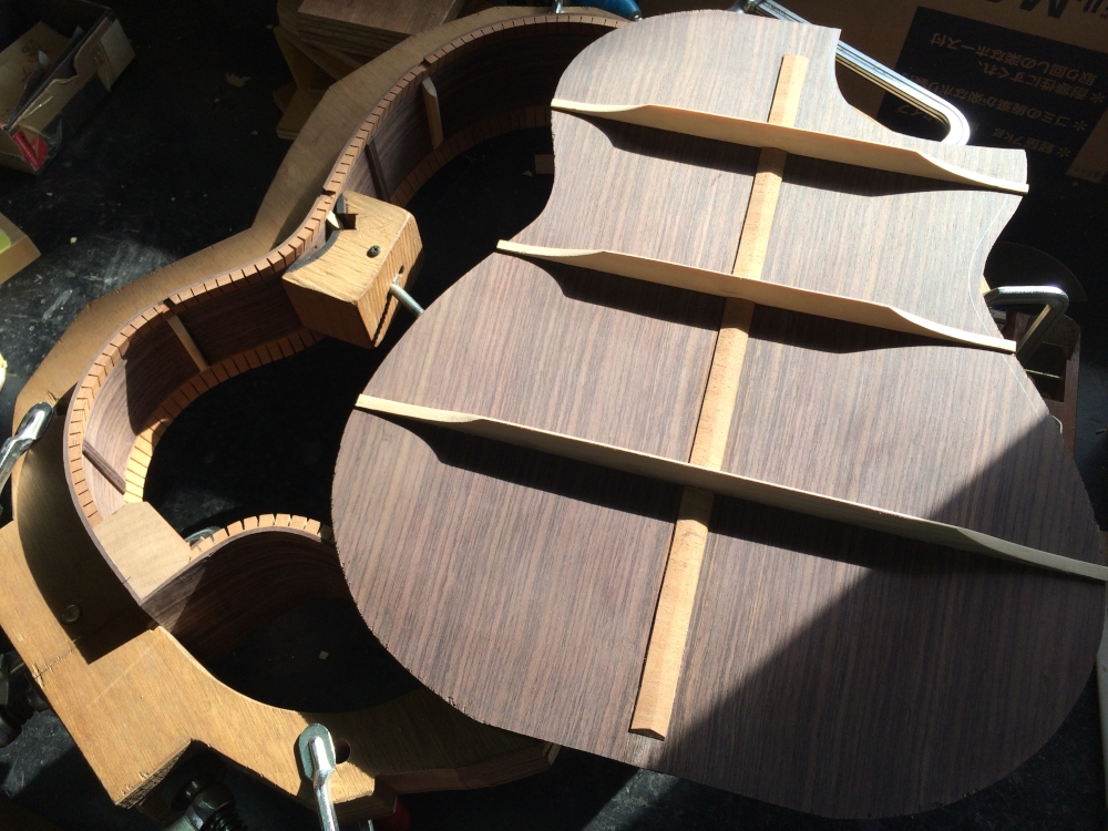 あぁ、俺、昨日更新してなかったんだね。昨日から今日にかけて、裏甲接着。まずライニングの鉋がけ。フォークギターほど曲面はきつくないけどカッタウェイはちょっと気をつかう。サイズ変更IMG_4671