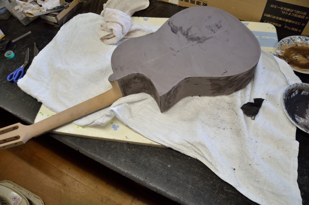軽い二日酔いのせいで今日のスタートはお昼近くなってから。研磨研磨。木地を磨いてナット溝つけたら、とのこ目止め。頭から木の粉まみれ。明日も研磨。