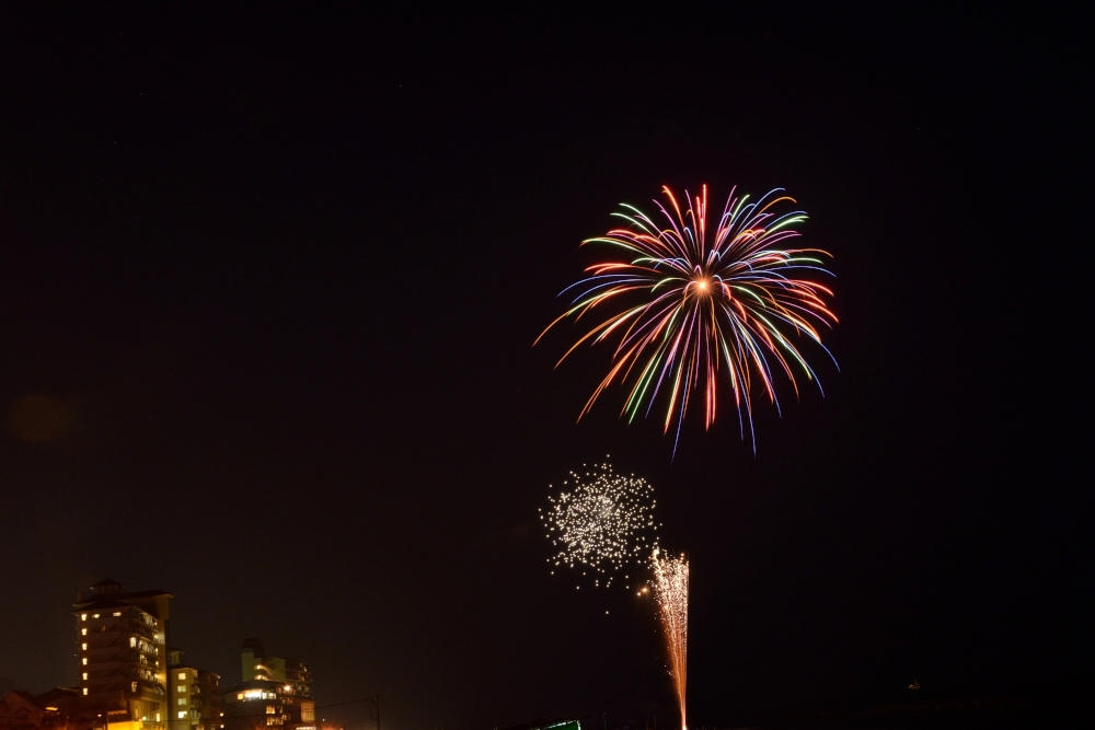 温泉街の海水浴場では毎晩花火が上がっていた。10分程度だけど観光地ってすごい。たらふく食った数日だった。