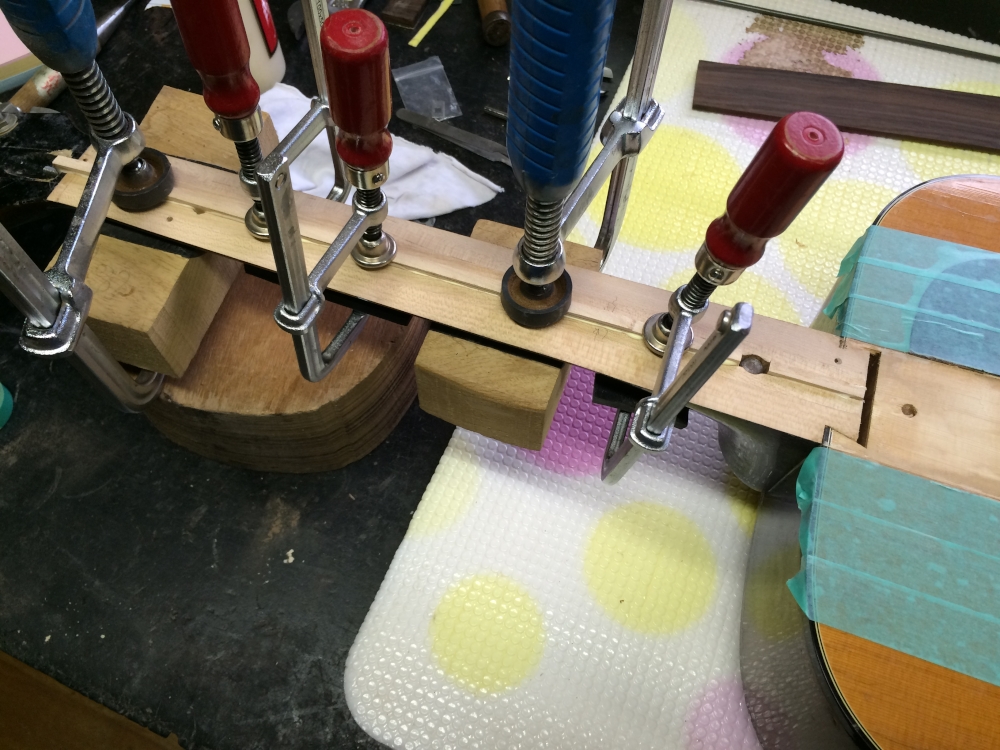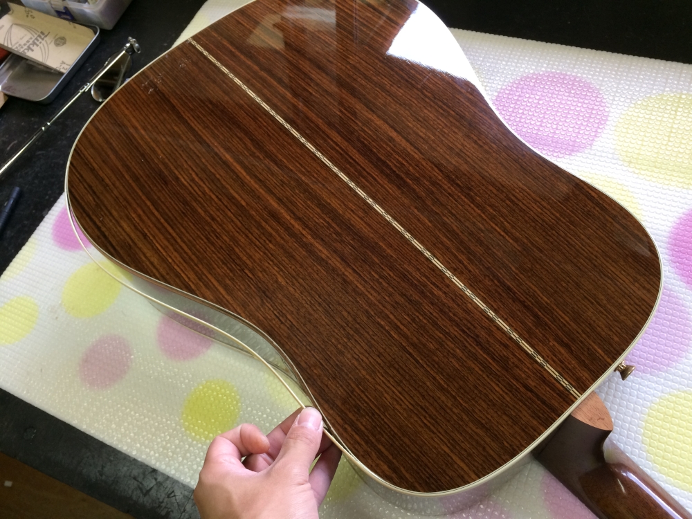 ロッド交換して指板を貼りなおしてくれという依頼。他にも直した方が良さそうな所はあるものの、その他には手を付けないという話。ビンテージともなるとオリジナルであることが価値になったりもするから難しいんだねぇ。
