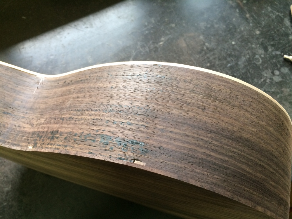 ロッドが回し切ってしまっていたというのだが、溝を見ると非常に湾曲が浅くロッドのきき幅が極めて狭い。ストッパー部分で深さに余裕があったので少しメイプルを貼って湾曲をやや深く変えた。せっかくロッド交換するんだからちゃんと利いてほしいからね。