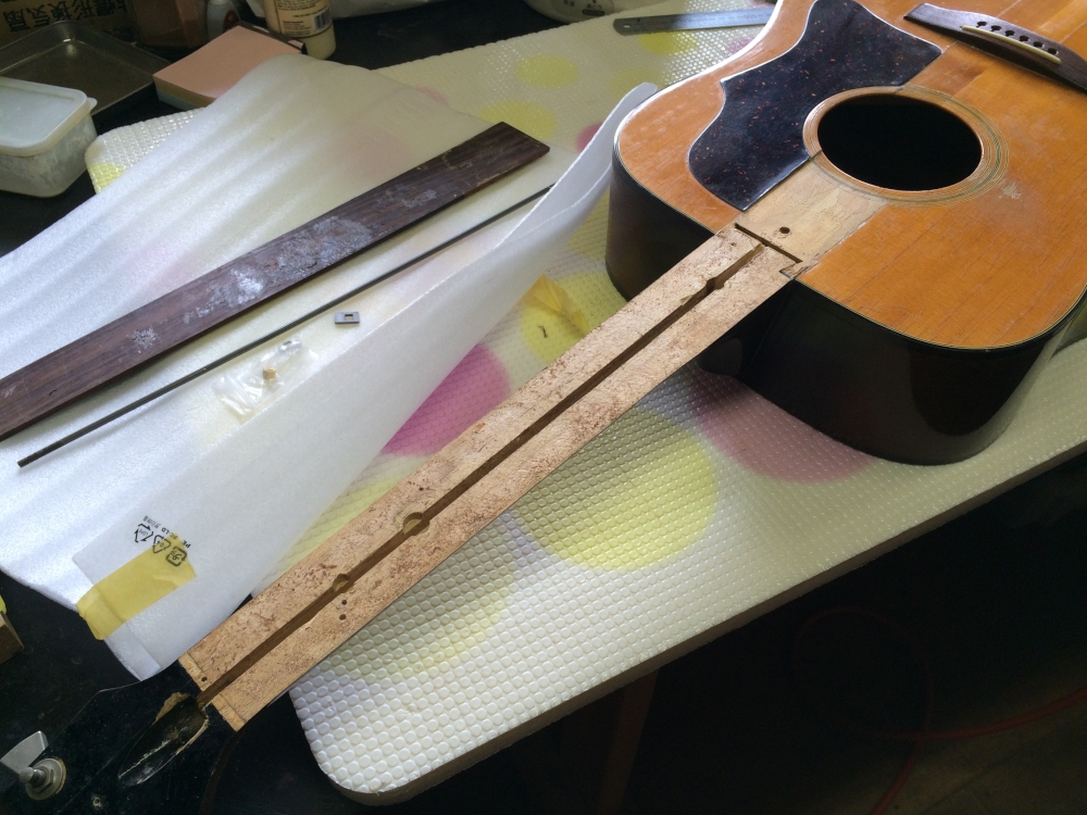 とある楽器屋さんから下請けで修理のお仕事いただいた。よほど忙しいらしく作業途中の物が届いた。非常に綺麗に指板がはがされている。指板剥がすの上手だなぁ。ご覧のとおり70年代のJ-50。