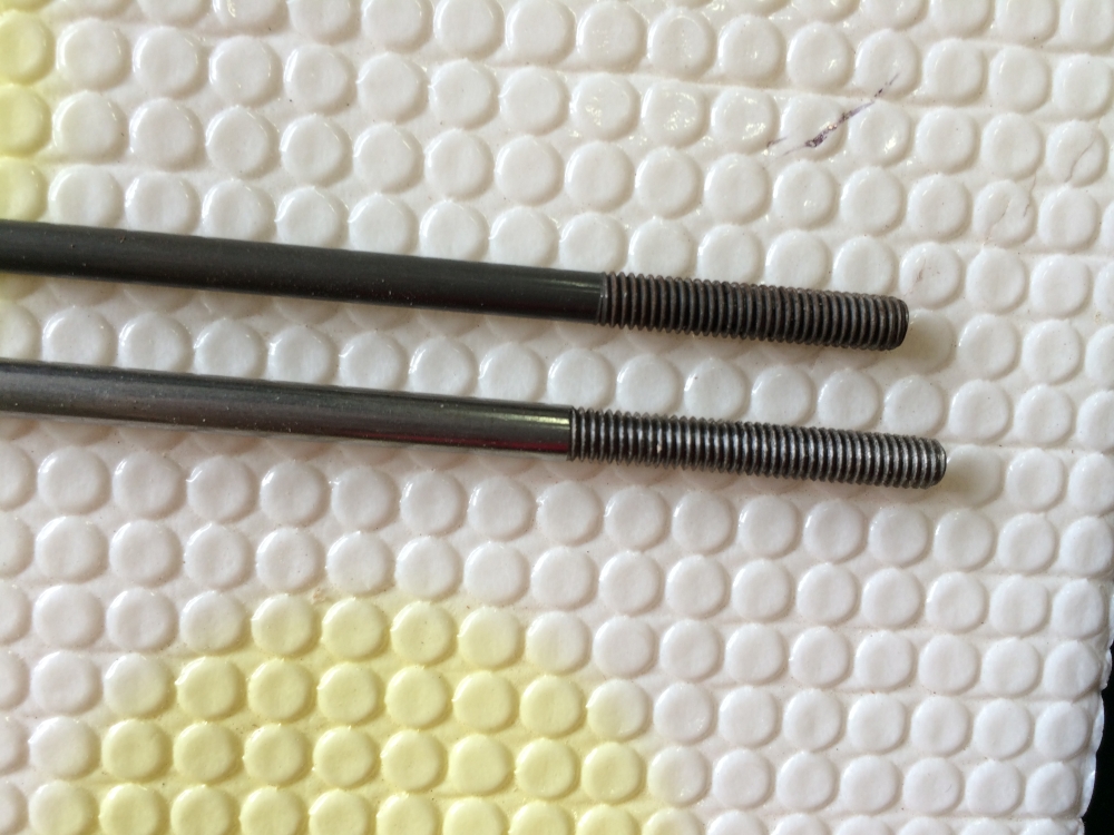 同梱されてきたロッド、ネジ切ってあるところとその先とで太さが違う(写真上)。これだと単純に長さに合わせて切るわけにいかない。切るならお尻から、ストッパーになる別の細いナットも必要。うちでで使ってる太さ一定のロッド(下)を使うことにする。ネジ部分はともにインチサイズで同じ太さ。