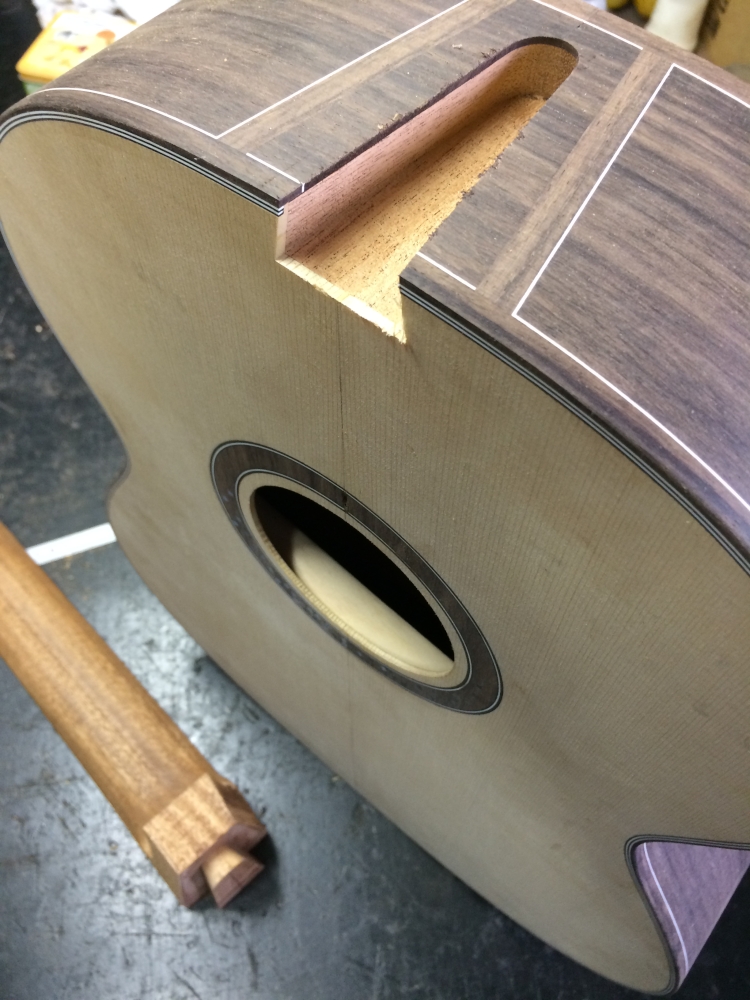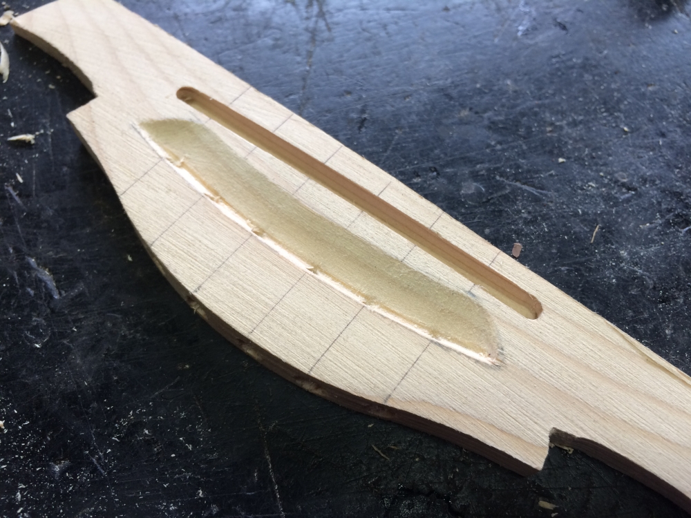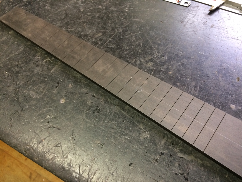 作業は指板1本を溝切り。ガットにしては細く見えるだろうけど、これにバインディングがくっつくので。