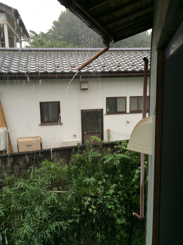このひどい雨、目下の問題は、ハシゴでは届かない作業場裏の雨どいである。