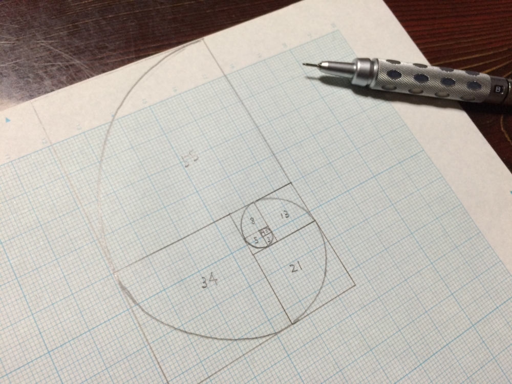 というように最初の2つを0と1に定義した時、すべての項が前の2つ項の和になっているというやつで、これが黄金比に収束するっていう。計算式になんてハナからついていけない。ただ、黄金比の話になると必ずと言っていいほどこの数列で描いた螺旋がオウムガイと同じだと書かれている。これがどうも気に入らない。昔からオウムガイやアンモナイトが上手に描けず苦心してきた。書き出した方向がヘタクソすぎて早々に方眼紙からはみ出した。とにかく、フィボナッチ数列で描いた螺旋じゃぁ絶滅近い螺旋の崩れたアンモナイトを想起してしまうじゃないか。