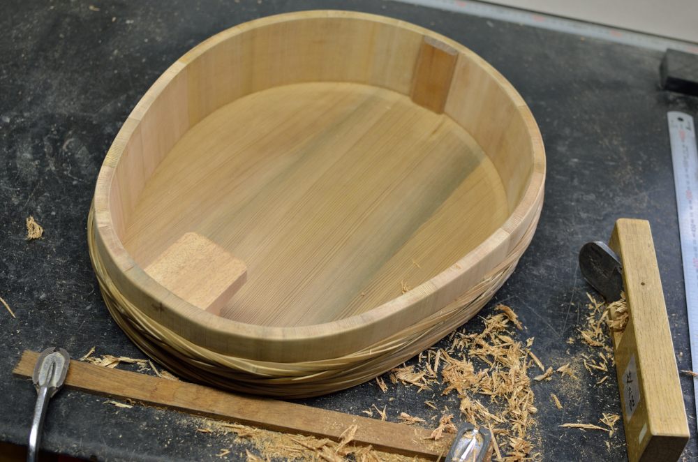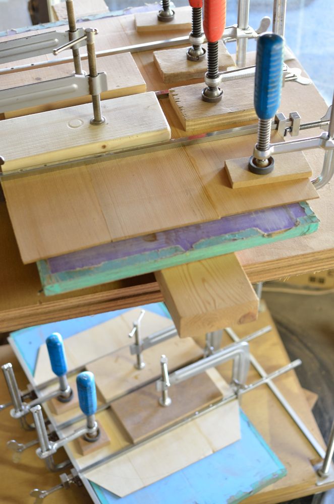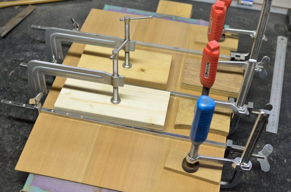 表板は厚みを出してはぎ合わせを。3ピースだけど片方ずつ。白い材と黒い材とあるんだけど、何材って言ってたっけなぁ?白い方はヒノキ?ヒバ?黒い方はレッドシダーっぽいけど国産材のはず。どちらも香りが強い。