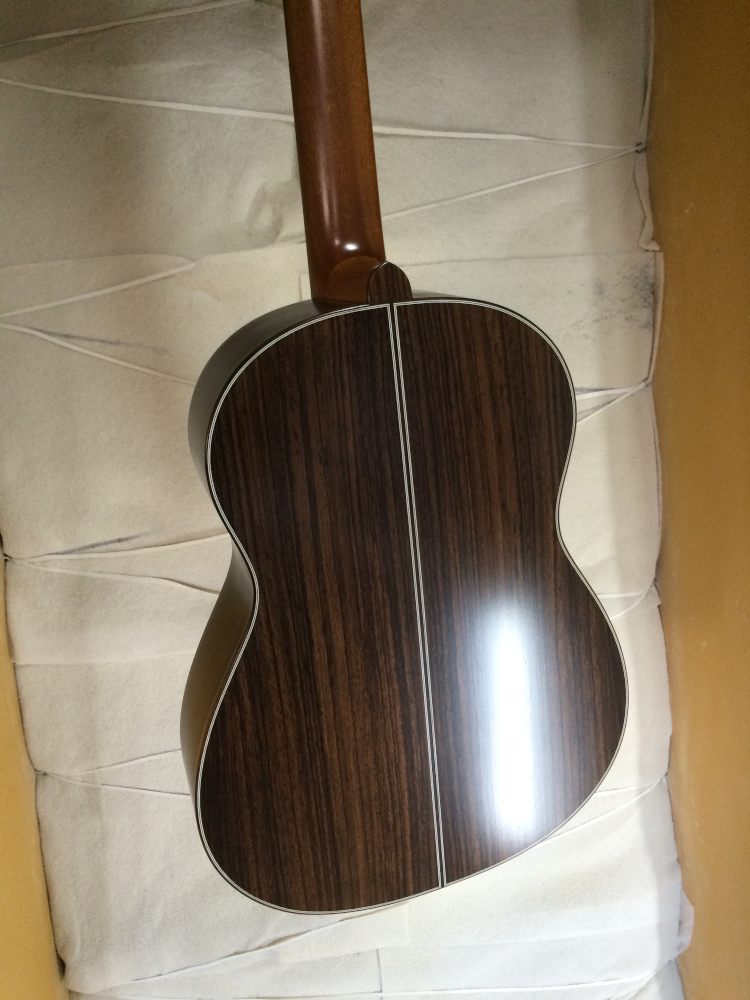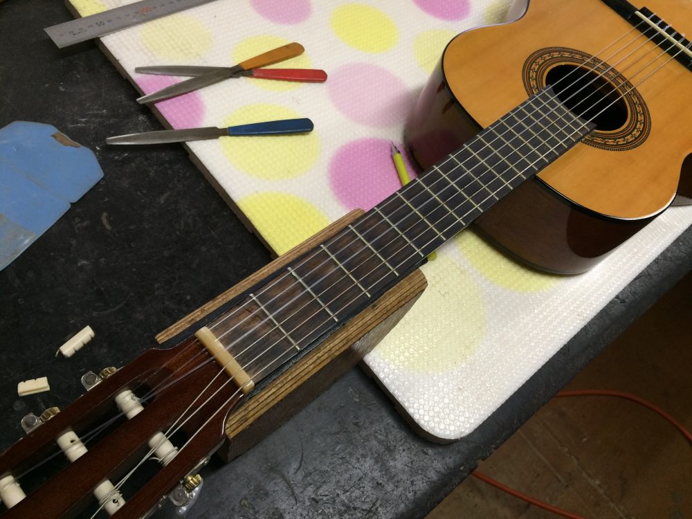 ナット交換はタカミネの小ぶりなガットギター。ナットが真っ二つに割れていた。すごく小ぶりに見えるのにスケールは600近くあるんだね。