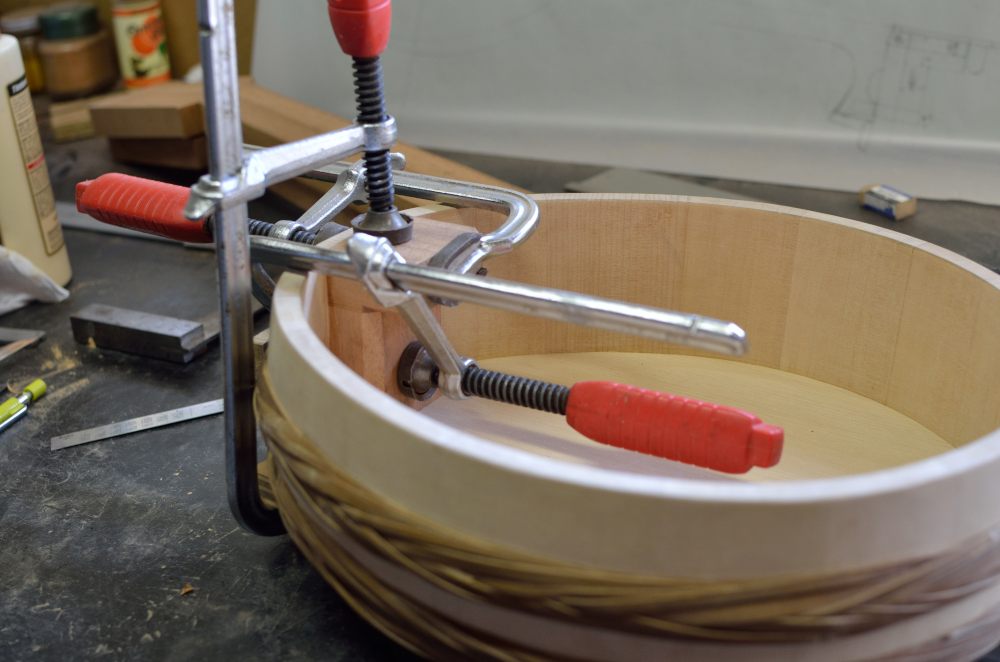 何が難題かというと、一番難しいのはネックジョイント。桶の側面にあるタガってやつが邪魔でこのダヴテイルができない。タガを切ってはいけないし、タガを外すと桶でなくなる。ダヴテイルができないなら次に考えるのは三味線のスルーネック作戦。しかしこのタガが側の中央を広く占拠していてそれも無理。できればビス止めを避けたい。少なからず、タガのある側面は接着面として使えない。直線無いし。上の写真みたいに隙間なくぴったりって訳にはいかない。悩むでしょ。オーダー主を知らないけれど高橋佳生さんからの頼みとあっては何とかしたいところ。宗さんにもさとう音楽事務所にもお世話になっているしね。