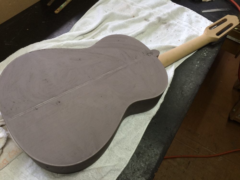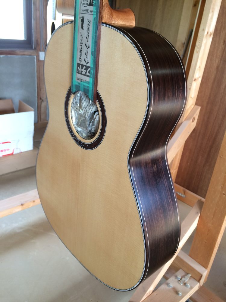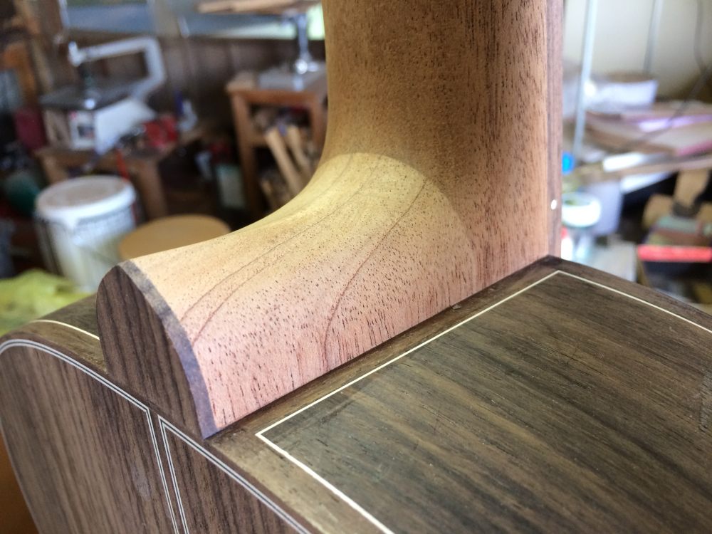 ネックヒールは一般的によくあるクラシックギターのヒール形状のように脇をくびれさせていないのは、ヒール脇への飾りの入れやすさと、側板とツラツラにしたカッタウェイとの統一をはかるためであるが、その分、尖ってハングしたヒールラインと自然な曲面でつなげるのは易しくなくて気をつかう。