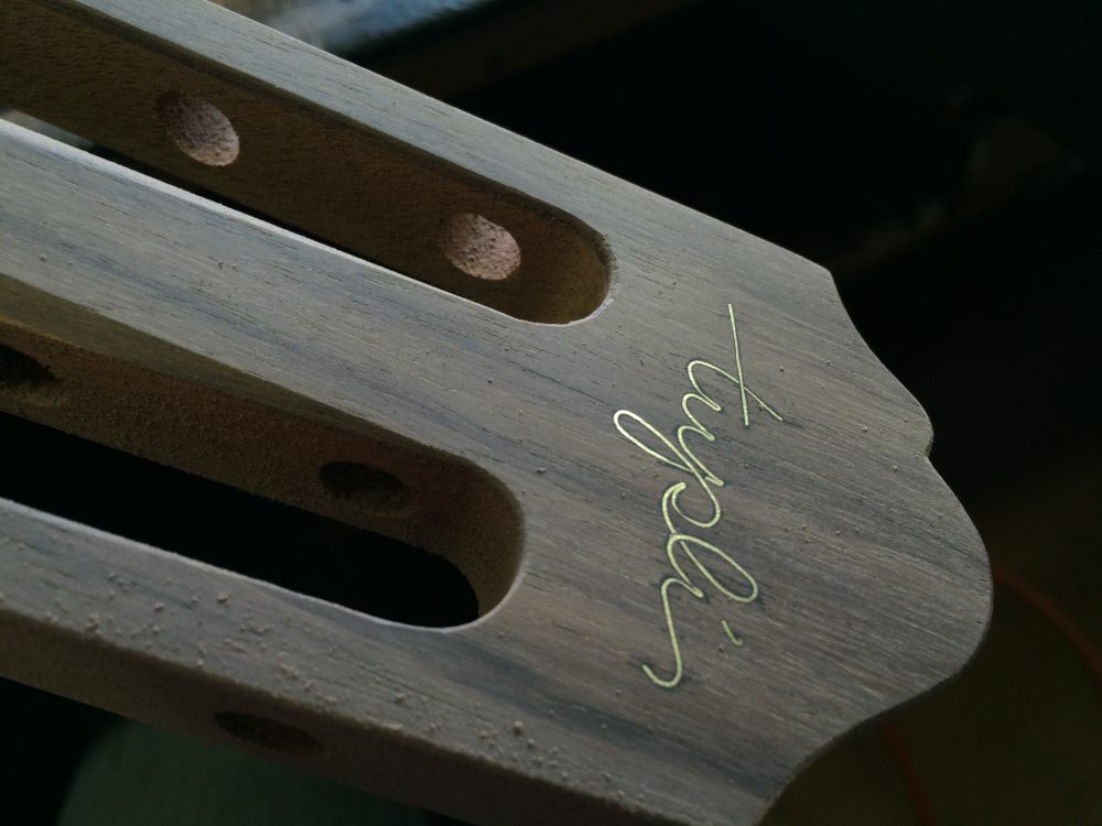 ガットギターのロゴには貝のインレイよりこっちの方がお似合いなのかもしれない。