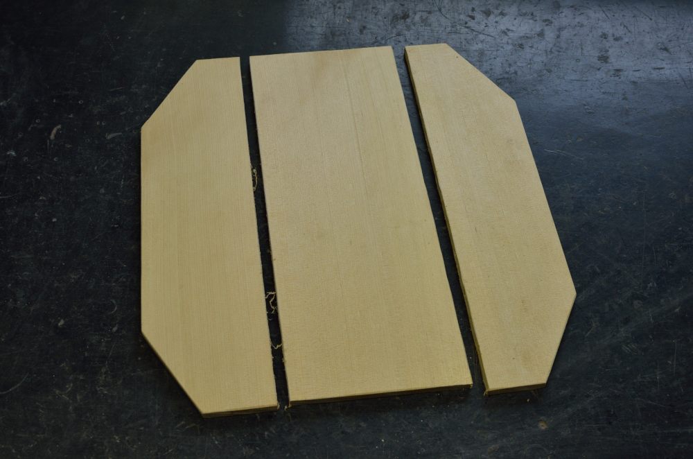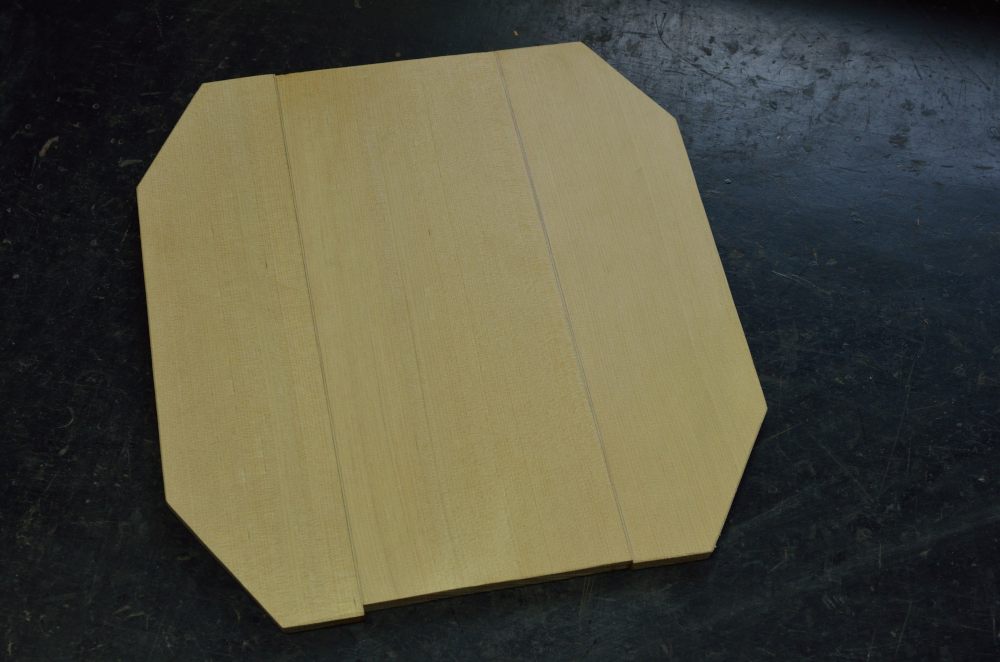 ジワリと桶ギタースタート。トップ板の一つ、接ぎ部分から切り離し。接ぎが楽器仕様ではなかったからってだけじゃなくて、そもそもそうしないとウチの小さなプレーナーでは厚み出しができない。このあたりがこの企画の気持ち先行の勇み足ではなかんべか。