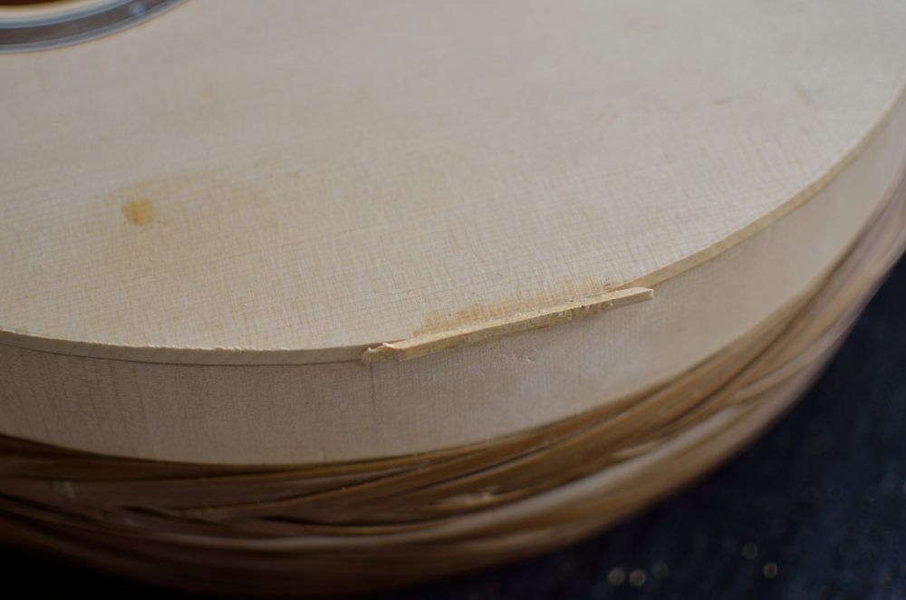 その6か所を固定してもまだ変な音がする。力木はもう剥がれていないのに。どっか割れてんじゃないかと見ていたら、過去にサイドが割れて修理してるみたいなんだけど、その補強材がはがれかけていたんだね。しっかりくっついていたら狭い箱の中で手さぐりだけで剥がすなんて無理なんだけど、はがれかけの3つが取れた。これをちょっと加工して再接着して異音が消えた。オーナーさんは過去のサイド修理を知っていただろうか。