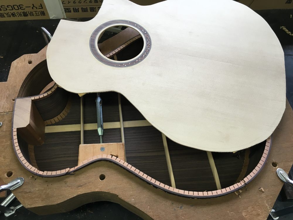 ドーミングに由来する 2016年3月8日 tupli コメントする 朝は霧が出て、むわんと生ぬるく湿った空気だったが、昼には晴れて期待通り湿度も下がった。力木削ってさっさと箱にしてしまう。今回はいつもより少しネック角を強めにつけたかったのだが、トップのドーミングが一緒だから結局同じくらいになった。