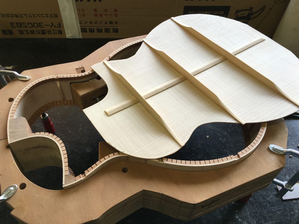 しかもあ(?) 2016年4月6日 tupli 2件のコメント 昨日、裏力木を接着した。木曜日の雨予報を見て接着したのは裏側だけ。 今日、サイドを整えて裏板を接着。雨の前に接着できて良かった。気候で動く材っぽかったので。