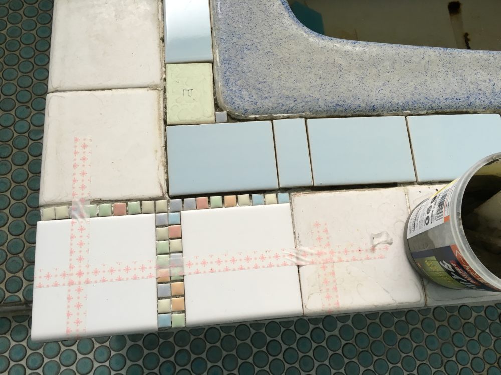 風呂場タイル、目地を埋めて完了。周囲が美しくないから写真には収めてないけど作業範囲はこの6~7倍あったのだよ。最後の風呂釜とのシーリングは苦手な作業だった。まだ壁のタイルはあちこちでひどく割れているんだけど、それまで気にしだしたらキリがないしこの家には住めなくなっちゃうからここまで。