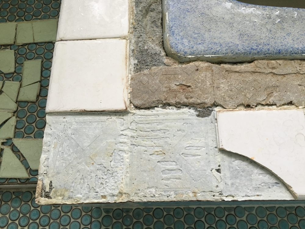 タイルの下に塗ってある接着剤、材質が2種あるなぁ。過去にも補修してるんだな。この接着剤をすべて取り除ける自信がないからこのまま上から施工してみる。