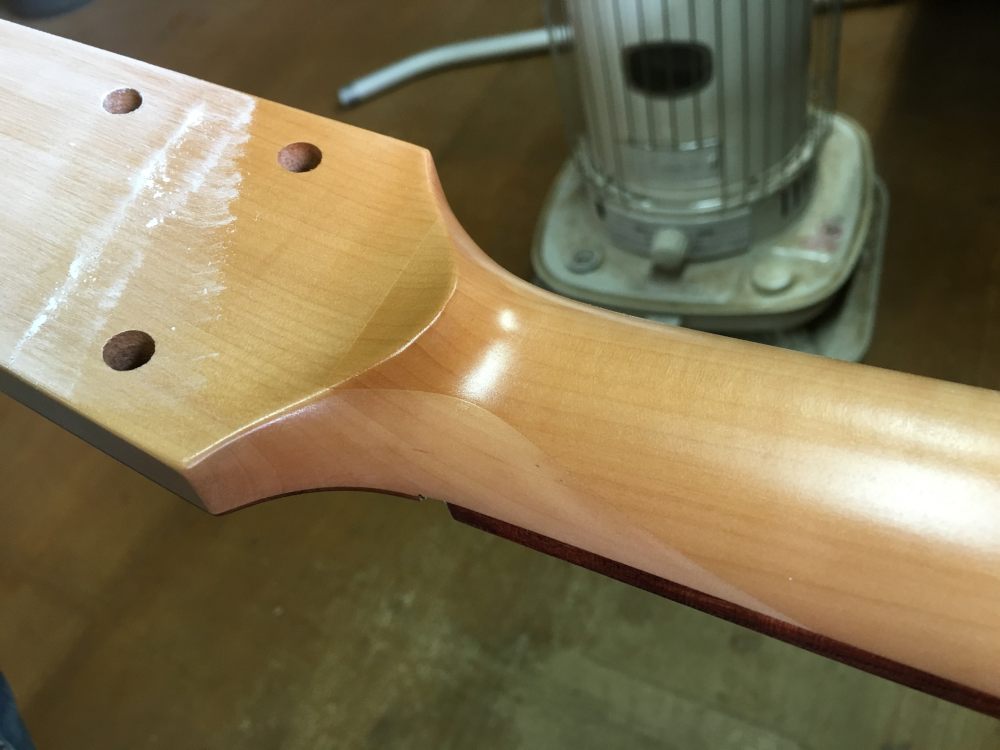 製作中ギターの塗装の研磨を。まだまだ導管にペーパーが当たらなくて平滑な面には程遠いのだが、この緻密なネック材はもう塗装面が整いつつある。ヘッドを貼って角度を作った接着面がデザイン的にもちょっといい。