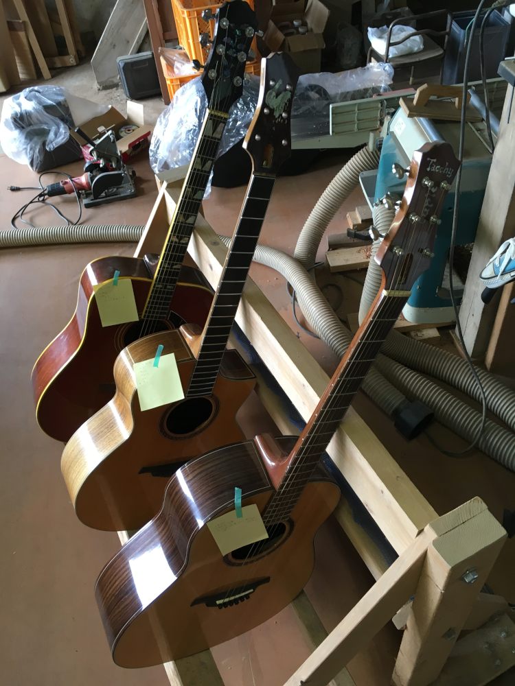 奥はカフェのマスターから、あげるから、どうしてもいいから、この子を何とかしてあげてくれと託されたまま放置されていたチャキ。ヘッドが折れたのを素人修理してあるのだが、美しくないけどちゃんと直っていて使えるんだけど弦高がやたら高く、ネックリセットが必要そう。