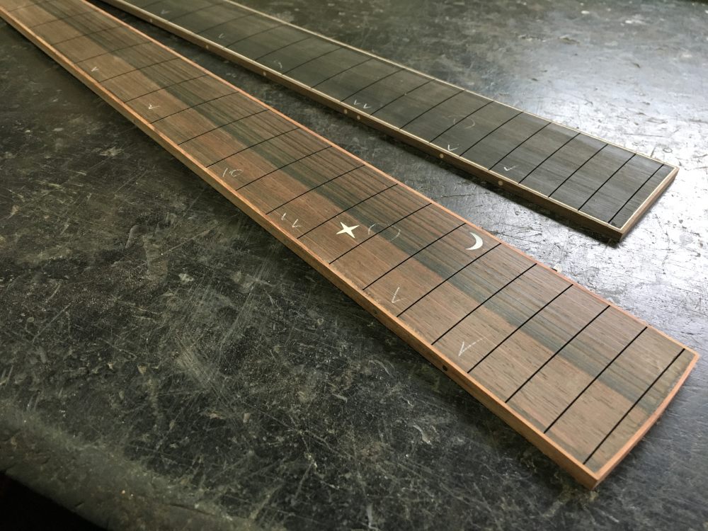 メイプルドットグッド 2016年5月2日 tupli 4件のコメント 突然の来客があったり、友人が遊びに来たり、親が孫の顔を見に来たり、連休らしいにぎやかな日々。合間を縫って指板が完成した。カリマンタンエボニーにブビンガという凝った組み合わせはワンポイントのインレイでポップに仕上がった。エンドのアールは言われないと気付かないかも。エボニー指板の方はネックを薄く作るために1mm薄くしたら思った以上にぺったんこだ。