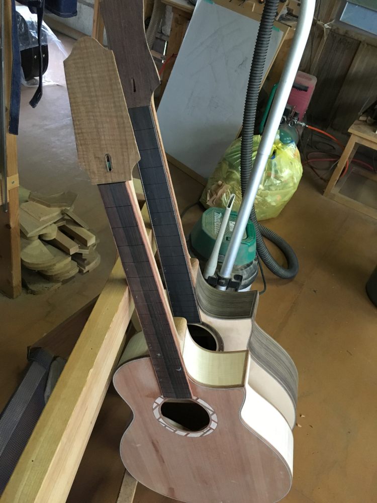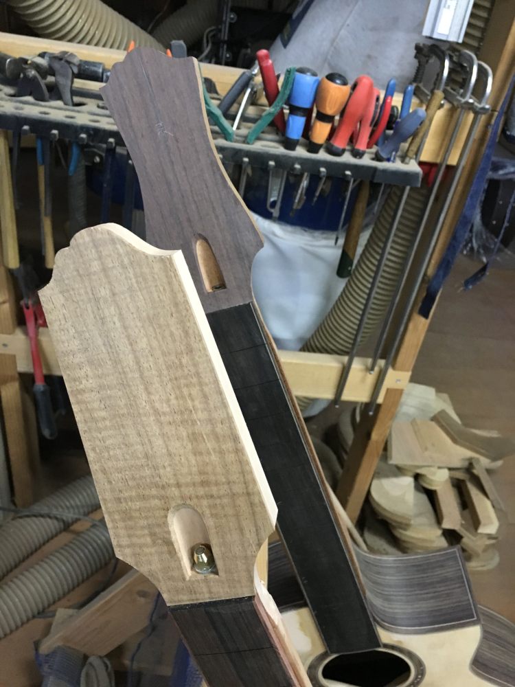 ナママウ 2016年5月7日 tupli 2件のコメント 指板とヘッドプレートの接着。 今日はヘッドプレートの余分を削り落としたところまで。手前のヘッドプレート材、コアに似てるけど、ナママウっていう材なんだそうだ。 午後、ございん学習室(小学校放課後学習室)の今年度スタートを切る説明会というか会議があった。昨年度で打ち切られる公算の高かった事業だが、財務省が条件付きで予算をつけてくれたという。いろいろ難しそうなんで単年度ごとだねー。
