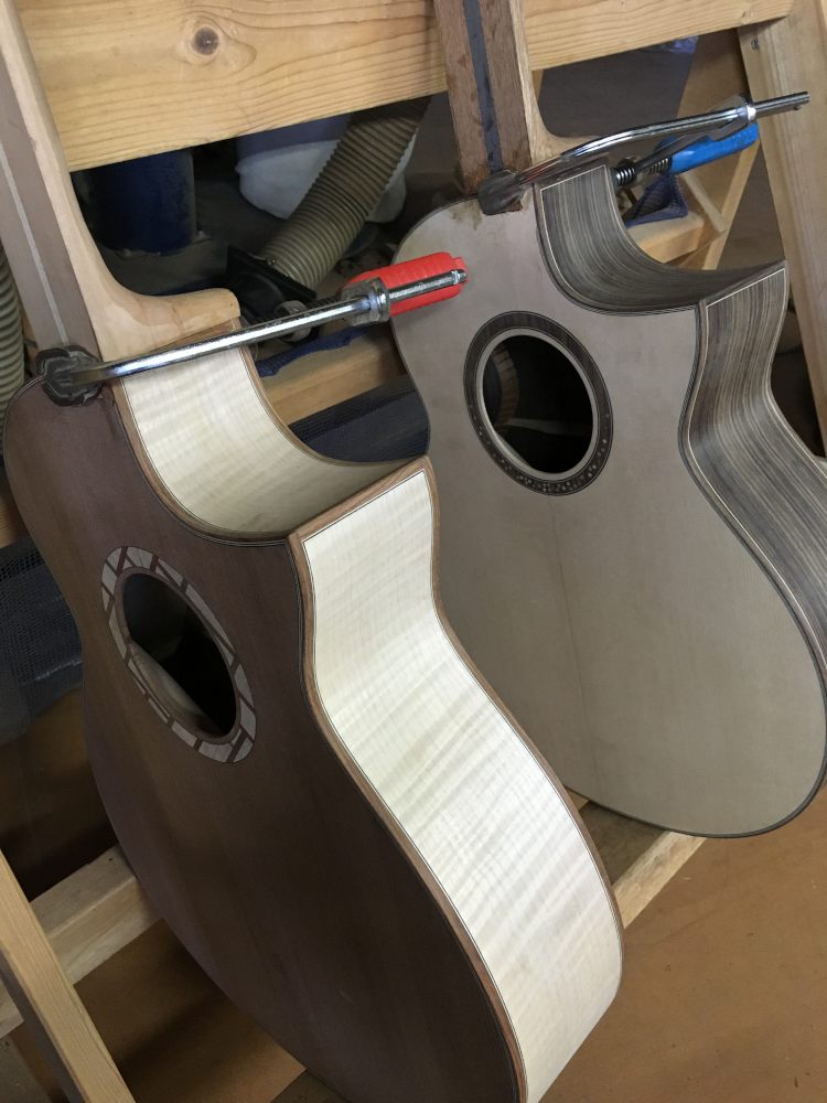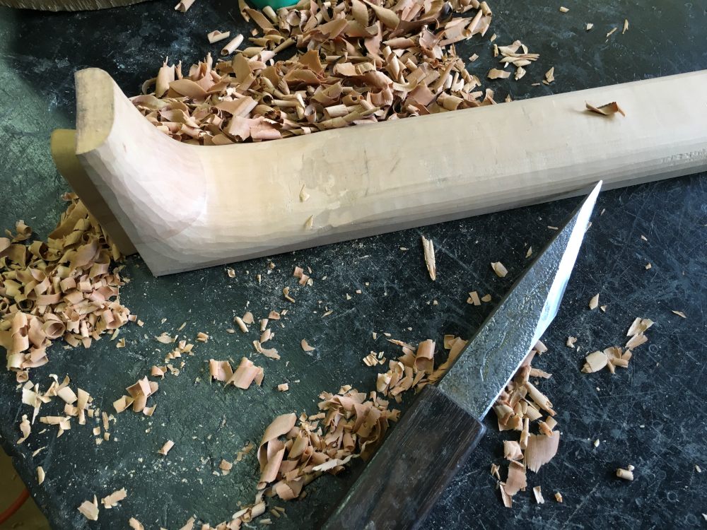 今日はヘッドプレートの余分を削り落としたところまで。手前のヘッドプレート材、コアに似てるけど、ナママウっていう材なんだそうだ。