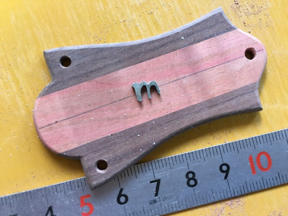 昨日の続き。モラード(サントスローズウッド)にピンクアイボリーを埋め込んだ。杢の出たピンクアイボリーはスクレーパーとペーパーでならして、裏側のローズをプレーナーで削って厚みを落とす。モラードって馴染みないし匂いは普通にローズウッドだからついローズって言っちゃう。プレーナー使うには最低このぐらいのサイズが必要だった。材を組み合わせているから通常より厚い3mmくらい。