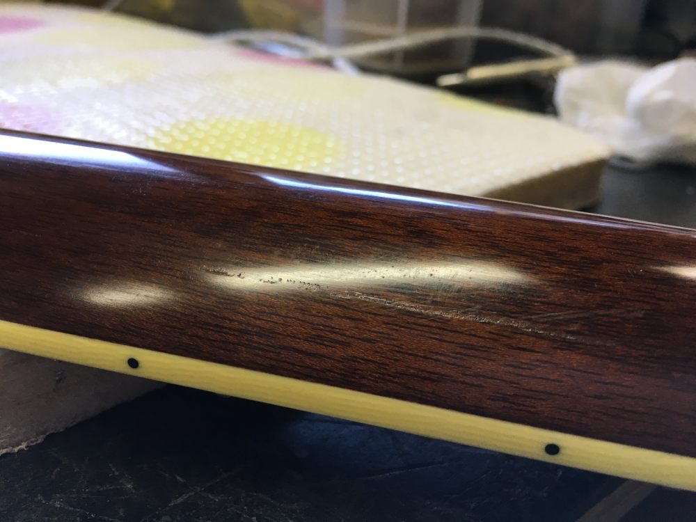 ブリッジは綺麗に付いた。が、その作業中、ちょっとネック台に置いていただけで痕がついた。これは尋常ではない。塗装中のギターでもこんな事はない。