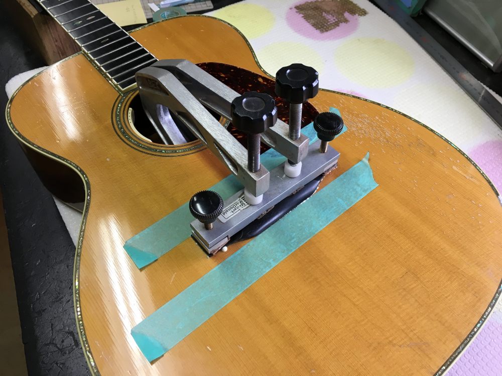 ブリッジ裏をトップのアーチにできるだけ合わせたら接着位置の塗装をはがす。例によってブリッジより1.5~2mm内側までしか塗装ははがされていなかった。で、接着。