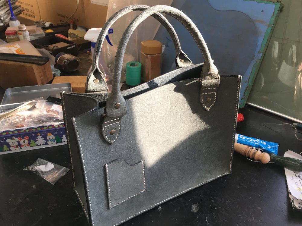 塗装の合間などで先週からチクチク進めていた仕事を仕上げた。自立する図書館バッグの依頼があって、大まかな寸法までもらっている。が、かなり自由にやらせてもらえている。今回は立たせて置いた時に取っ手が邪魔にならぬよう角カンを使ってみた。ただ、出来あがってみて、もらった寸法だと心もち小さくないのかなぁと感じている。