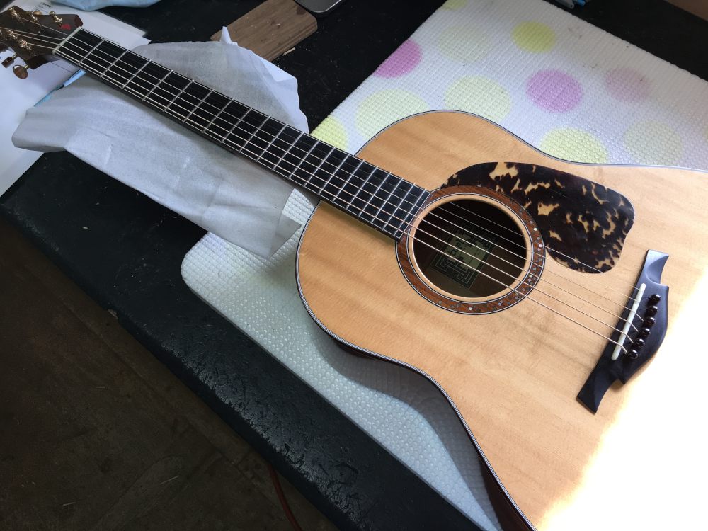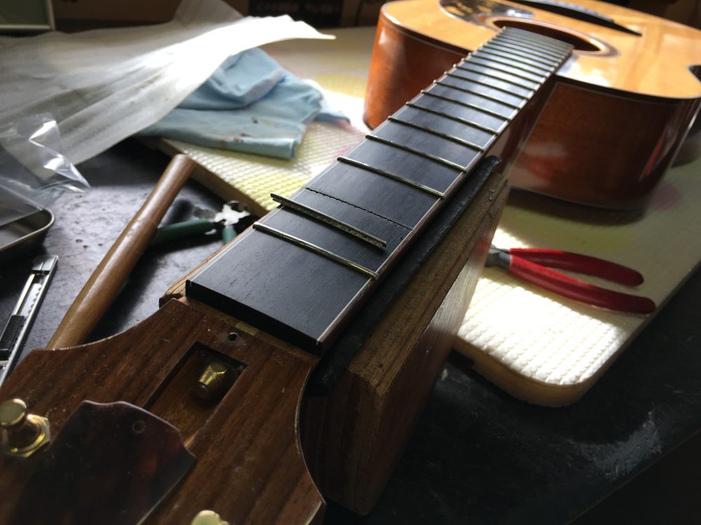 指板のエボニーが縮んだようで、指板脇に小さなクラックが入って、フレットが少し浮いている。それらの修理。フレットは一本ずつ抜いてそれを打ち直した。すり合わせして完了。何年もうちにあっていろいろな所に営業やらイベントなどで持ち歩いたギターだったんだけど、環境変われば木が動くのはしょうがないのかなぁ。