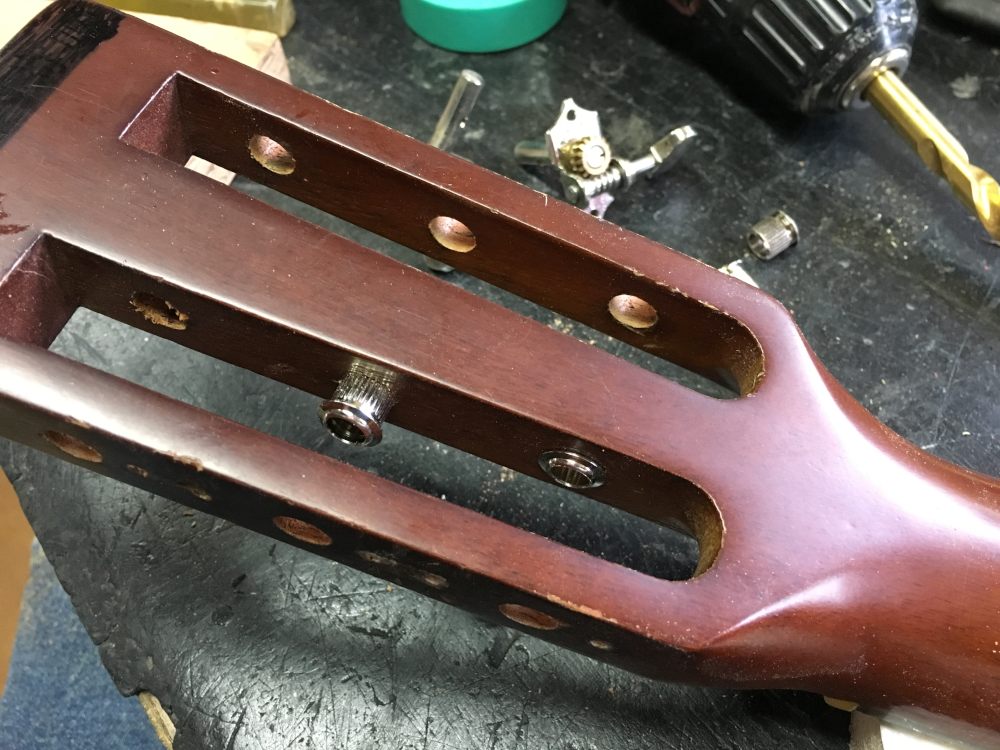 ペグはウェーバリーに交換されているんだけど、ポストが中央にほとんど届いていない。穴の径も合っていないから張力でペグが傾く。こんな小さなネジで支えきれるわけがない。そこでゴトーのソリッドヘッド用のブッシュをつけることにした。1mmでもポストが引っ掛かってグラつかなければ解決だから。ペグ穴を少し広げてブッシュの打ち込み。