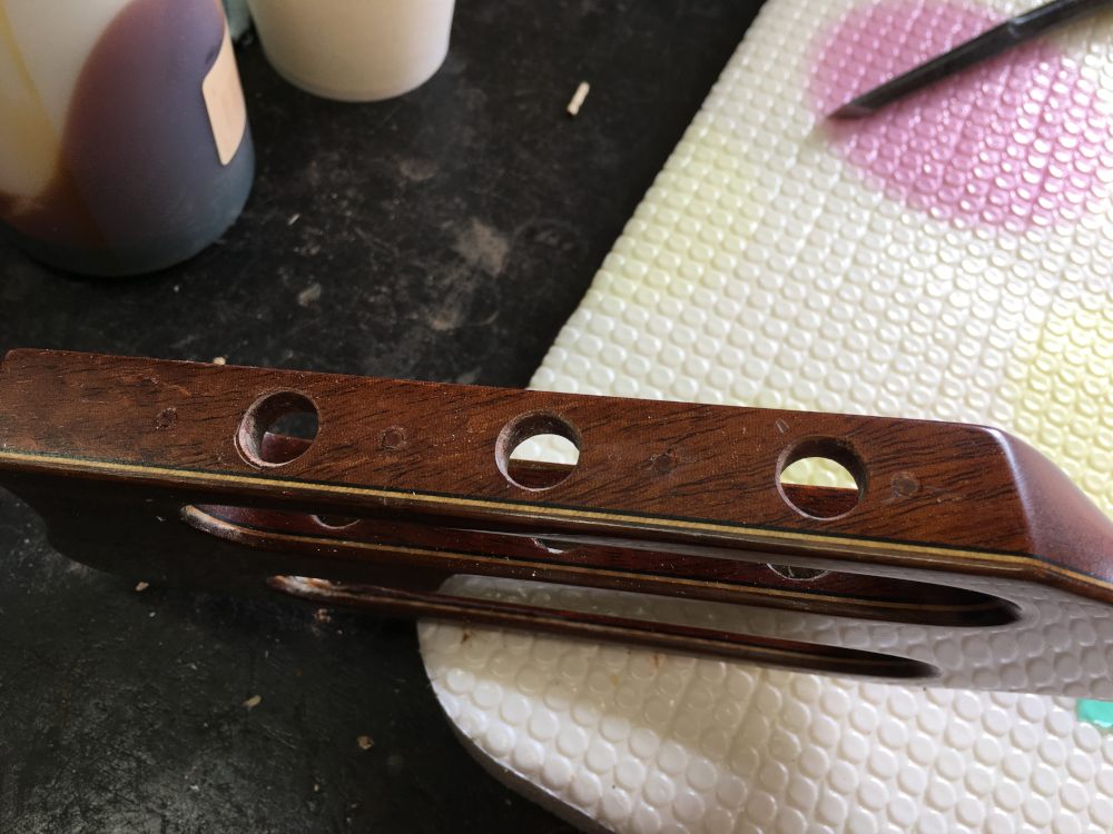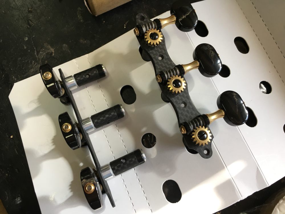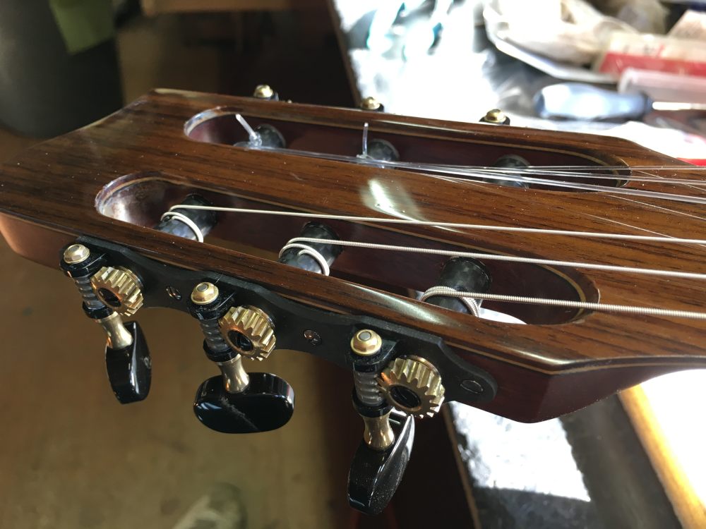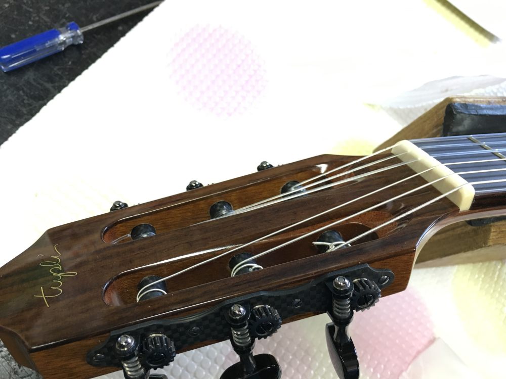 tupliのガットも糸巻き交換。真っ黒いバージョンも。これ、ビスがマイナスってところも凝ってるよねぇ。