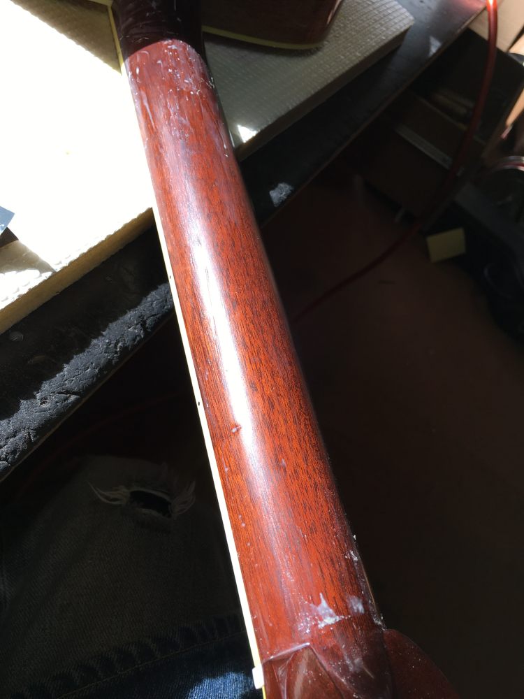 どこぞのケースに入れて以来、ネック裏がベトついているという。私もどこだかの安いケースにセラックのギターをちょっと入れてしまったら、布の痕がついてしまったことがある。内装の接着剤か何かの溶剤成分に塗装がやられたためであるが、一度ケースに入れただけでその後ずっと塗装がベトつくのだとしたら恐ろしい。ネックだけ艶消しだったりか何かで塗料が違いそうではあるがボディは何ともない。