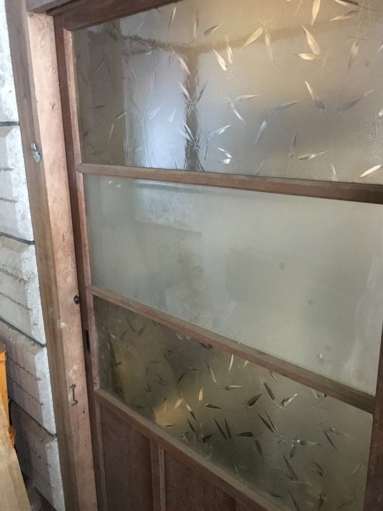 こんなガラスがまだまだたくさんある。デザインの種類は10通りほど。アルミサッシにはまったもっと頑丈なガラスもある。これらを買い取りに来てくれるような業者、ないかなぁ・・・。昭和レトロ、需要はありそうなんだけど。