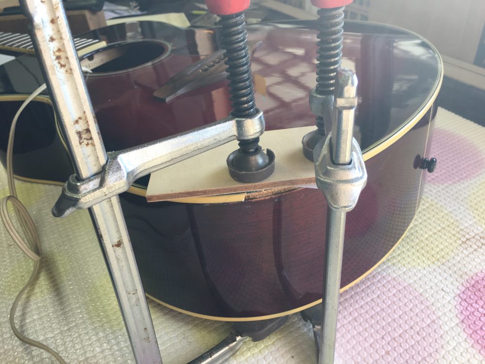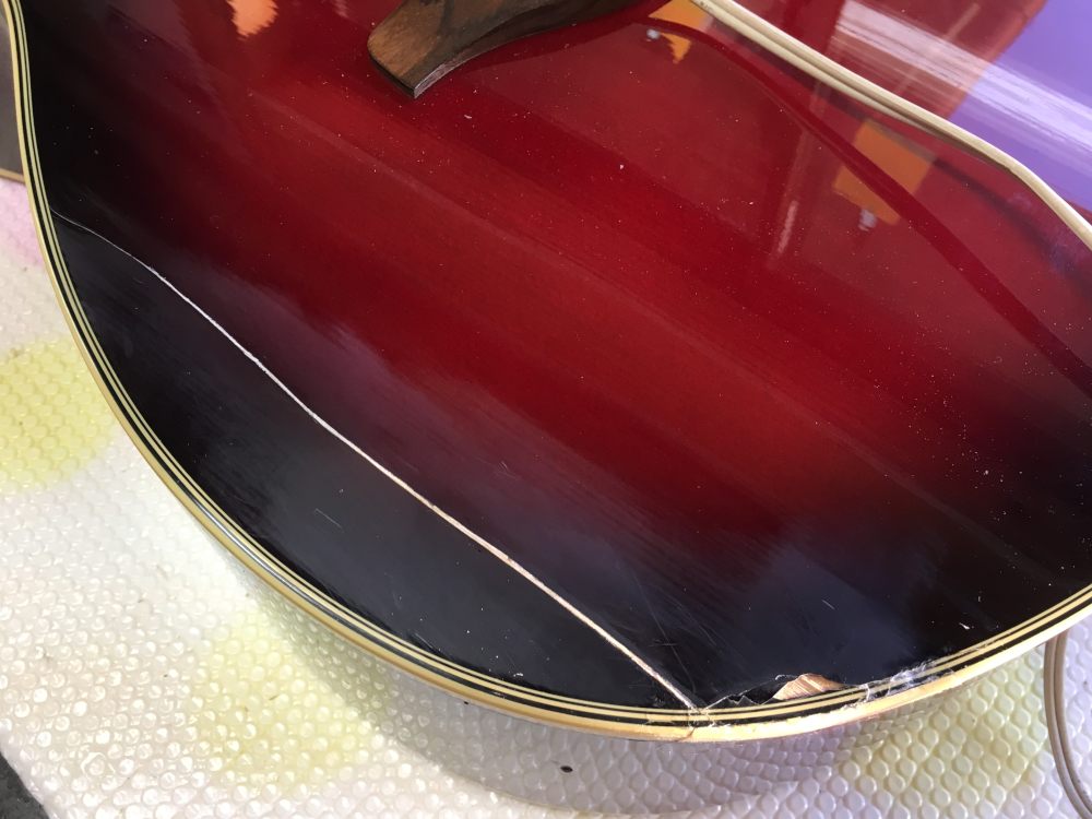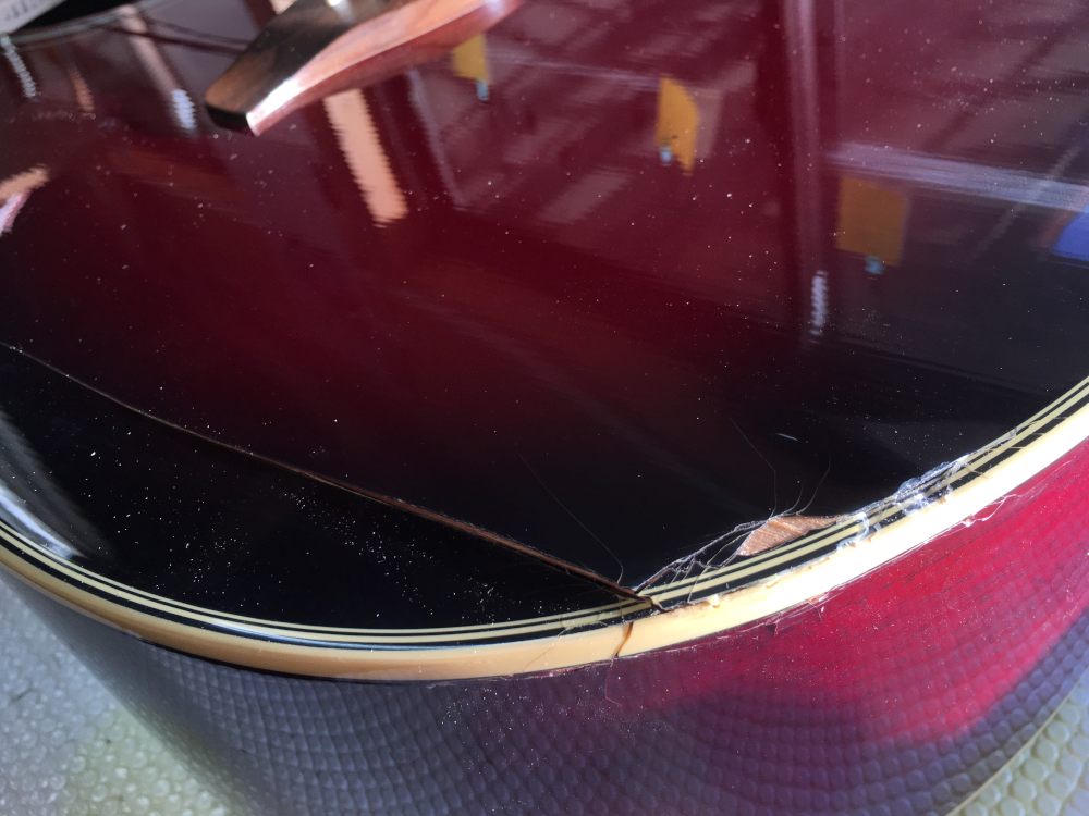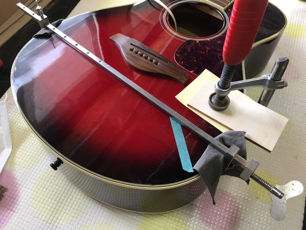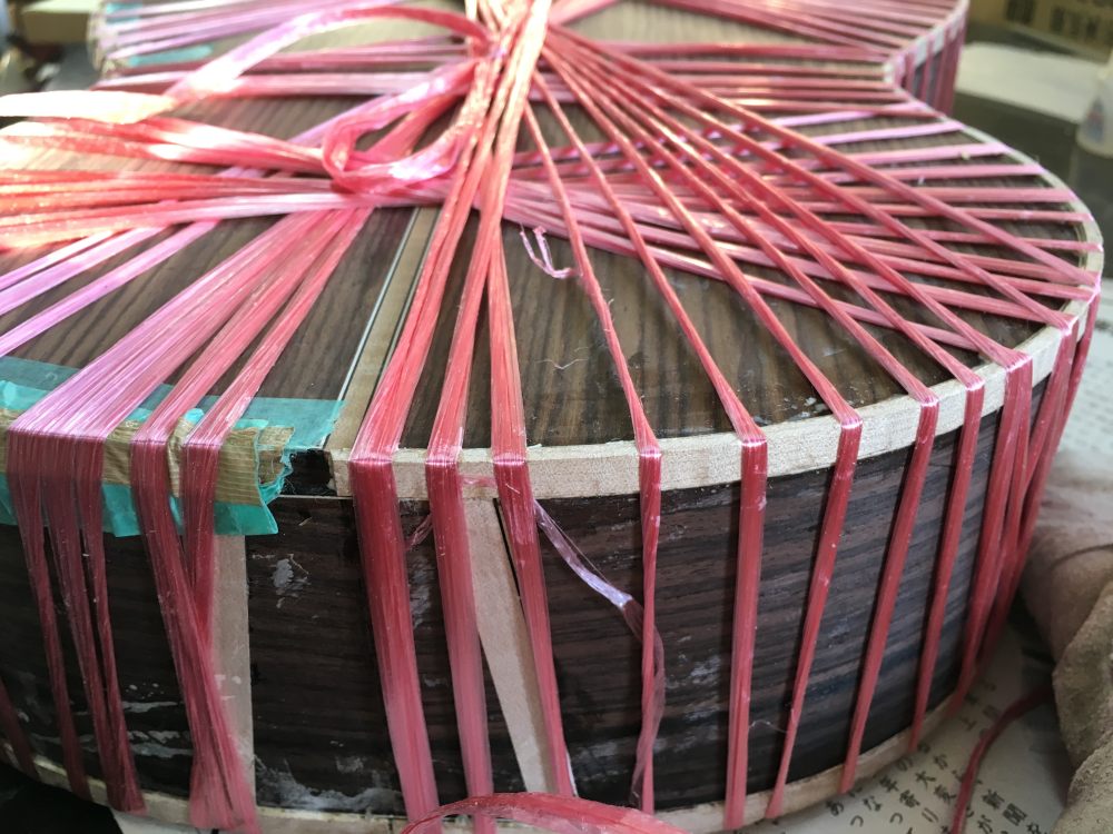 割れたトップに引っ張られてXブレースも裂けていた。これが酷くなくてよかった。まずはサイドから剥がれた部分とブレーシングとをいっぺんにボンドで接着。